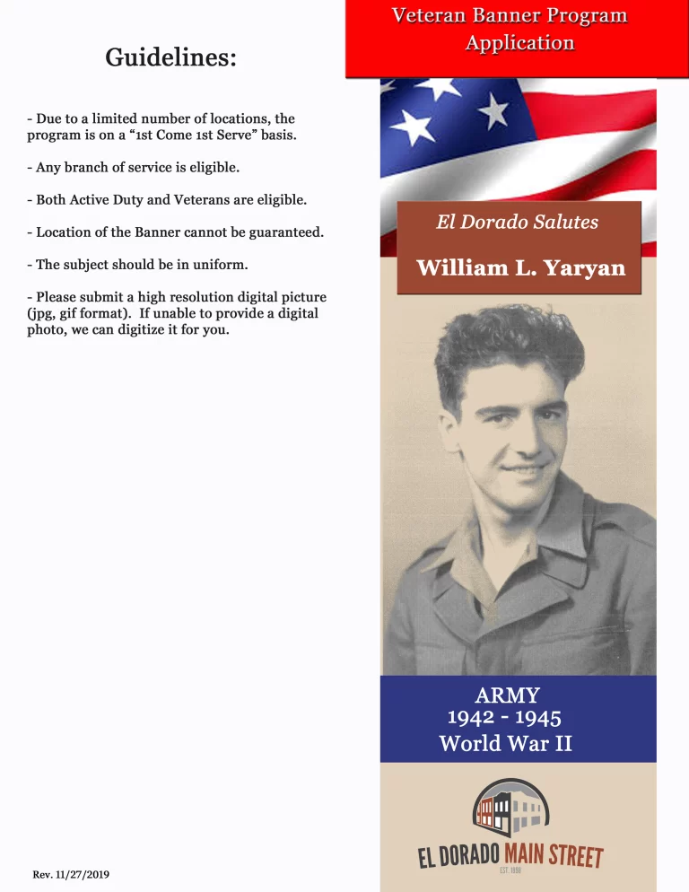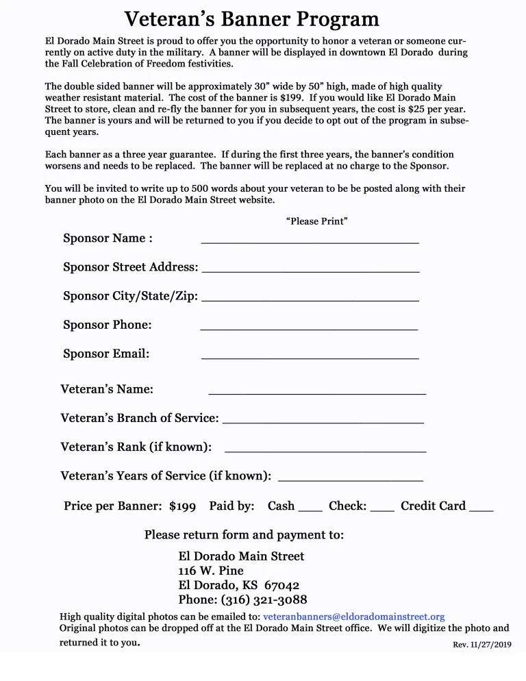 Veteran Banner Application This is a view of the front and back of the Veteran Banner Application. If you would like to sponsor a banner click the button below to open the application in pdf format, print and fill out. Click Here to open pdf for printing